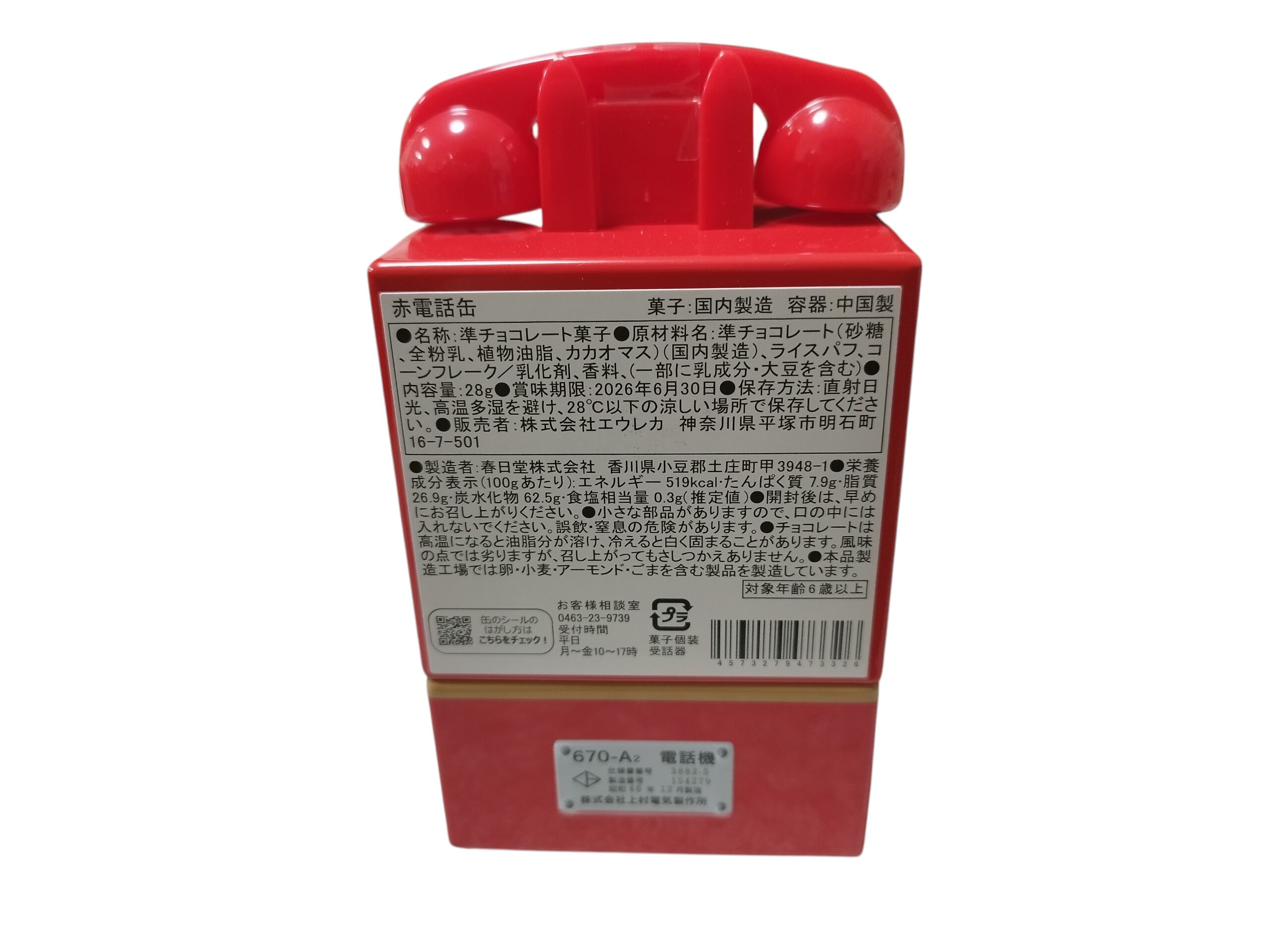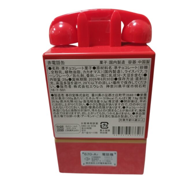 この商品は、春日堂が製造した甘くておいしいチョコレートが28g詰まった、贅沢で特別なブリキ缶のアイテムです。レトロで愛らしい赤電話のデザインは、見る人を懐かしい気持ちにさせ、心温まる存在感があります。大人も子供も楽しめる、特別なスイーツ体験が待っています。